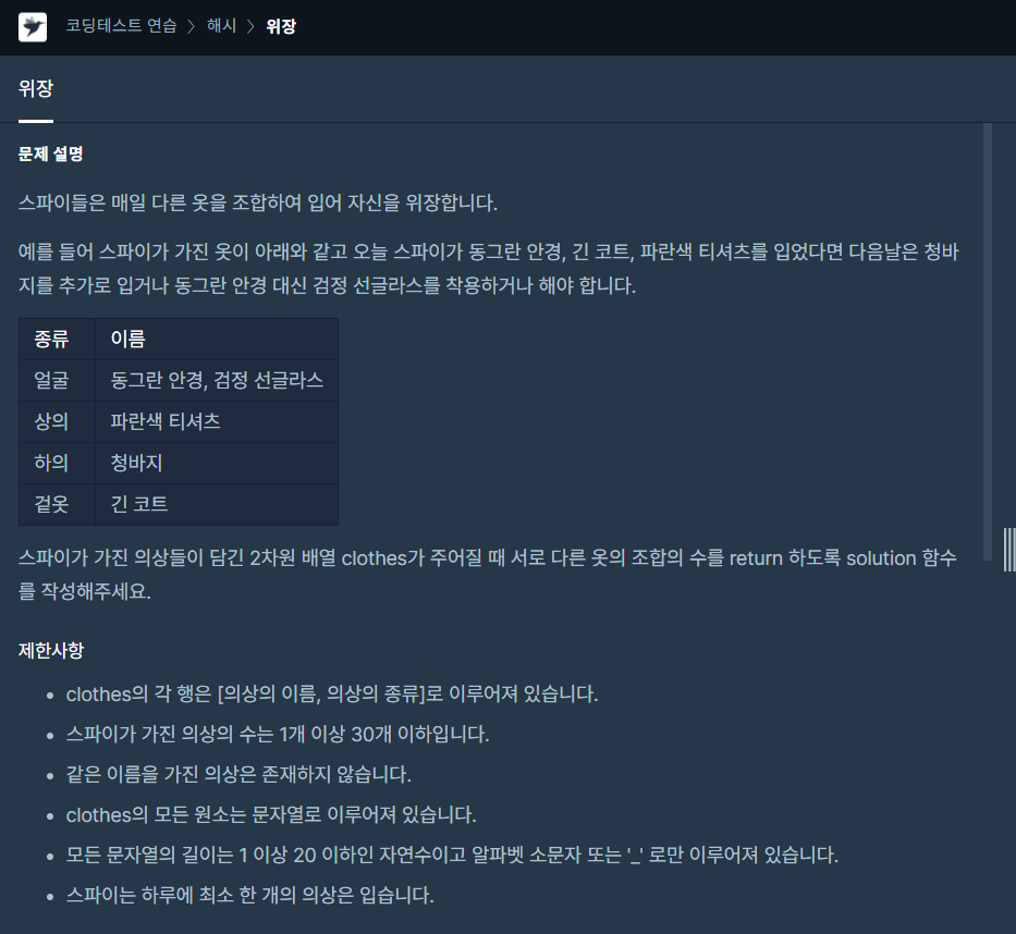 프로그래머스 해시 파트 level 2 첫 번째 문제에 이어 두 번째 문제 위장문제를 도전해 보았다.