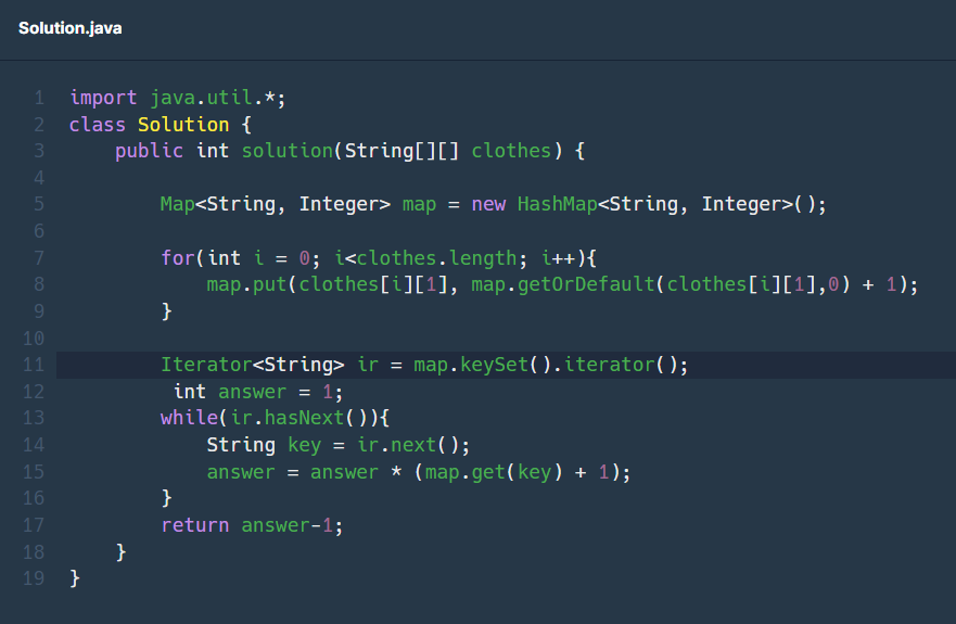 문제는 이러하다. 뭔가 문제에서 부터 Map을 쓰면 편할 것 같은 느낌이 확 풍겨온다. 하지만 막상 문제를 읽으면 서로 다른 옷의 조합의 수를 return 하란다 ㅋㅋㅋ