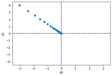 import numpy as np import matplotlib.pylab as plt def gradient_descent(f, init_x, lr=0.01, step_num=100): x = init_x x_history = [] for i in range(step_num): x_history.append( x.copy() ) grad = _numerical_gradient_no_batch(f, x) x -= lr * grad return x, np.array(x_history) def function_2(x): return x[0]**2 + x[1]**2 init_x = np.array([-3.0, 4.0]) lr = 0.1 step_num = 100 x, x_history = gradient_descent(function_2, init_x, lr=lr, step_num=step_num) print(x) plt.plot( [-5, 5], [0,0], '--b') plt.plot( [0,0], [-5, 5], '--b') plt.plot(x_history[:,0], x_history[:,1], 'o') plt.xlim(-3.5, 3.5) plt.ylim(-4.5, 4.5) plt.xlabel("X0") plt.ylabel("X1") plt.show()[-6.11110793e-10 8.14814391e-10]