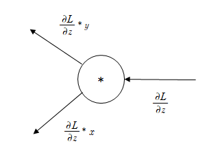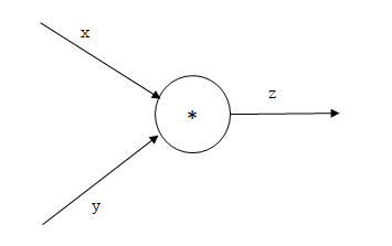 z = x y 라는 식으로 곱셈 노드의 역전파를 살펴보자. x에 대한 z의 미분 = y, y에 대한 z의 미분 = x가 된다. 이를 통해 순전파와 역전파를 살펴보자.
