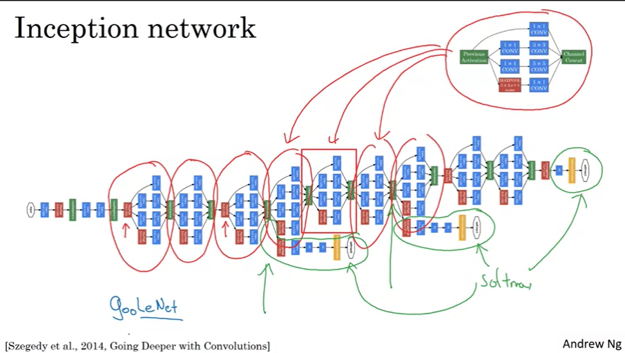 - GoogleNet 이라고도 불리면서, Inception 모듈들이 여러개 합쳐진 상태에서 각각의 모듈에 여러 활성화함수 처리를 한 네트워크망.
