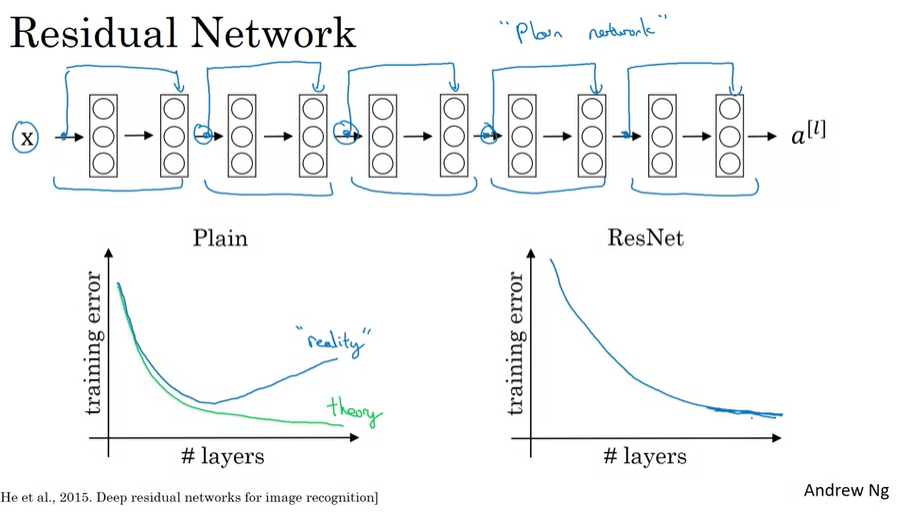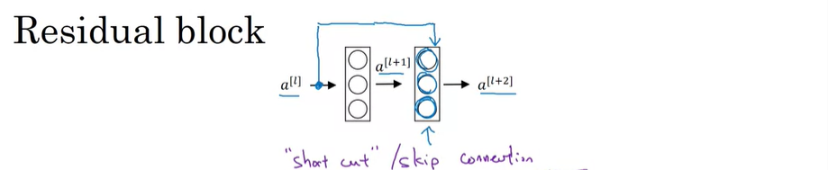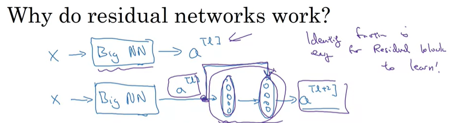 - short cut을 사용해서 skip connection을 하게 되면, a[l]을 a[l + 2]에 복사하는 것과 같은 원리이기 때문에 중간에 두 개의 Layer을 없애도 크게 문제가 발생하지 않는다. -> 두 개의 추가 Layer을 더하고 잔류블럭을 신경망의 중간이나 끝 어딘가에 더해도 성능에 문제가 발생하지 않는다.