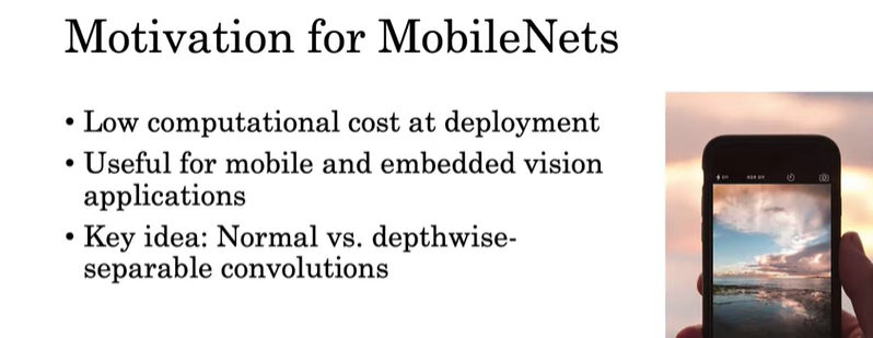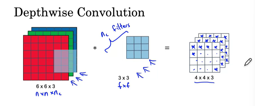 - Depthwise Convolution + Pointwise Convolution = Depthwise separable convolution