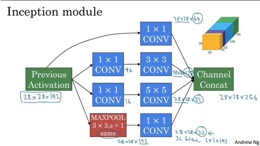 - Motivation : 필터 크기 또는 풀링 중 하나를 선택하여 커밋하는 것이 아니라 모든 작업을 수행하고 모든 출력을 연결할 수 있다는 것.