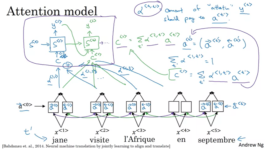 - alpha<t, t'>은 y<t>가 a<t'>에 대해 지불하는 attention의 양. 시간 t의 출력 단어를 생성할 때 시간 t'의 입력 단어에 얼마나 주의를 기울여야 하는지.