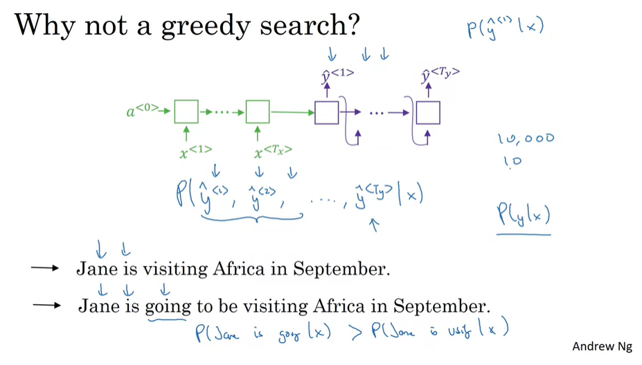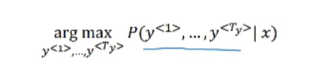 - 가장 그럴듯한 첫 번째와 두 번째 단어의 쌍을 찾아야 해서 조건부 확률 규칙에 따라, 첫번째 단어와 두번째 단어의 확률을 곱한다.( P(y<1>, y<2> | x) = P(y<1> | x) * P(y<2> | x, y<1>))