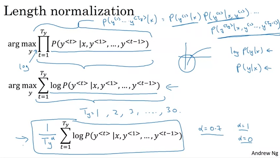 - 최대화하는 대신 번역문 내 단어의 수로 나누어 정규화 하는 방식 -> 각 단어의 확률의 로그를 평균을 내서 더 긴 번역문을 입력하는 페널티를 상당히 줄여준다.