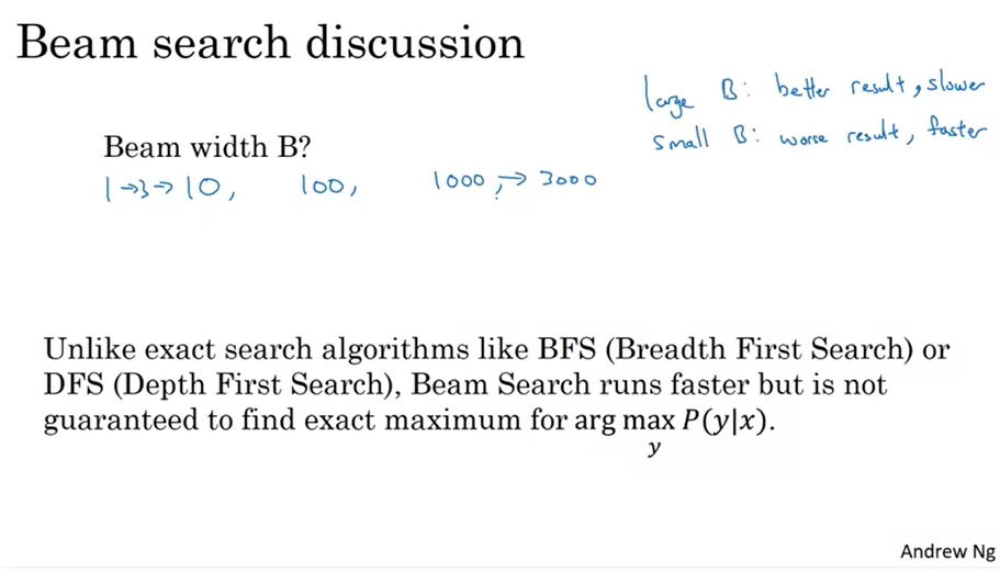 - Beam search에는 B라는 매개변수가 있어서 빔 폭을 설정할 수 있다.(B = n 이라면, n개의 가장 높은 가능성을 고려한다는 것을 의미한다.)