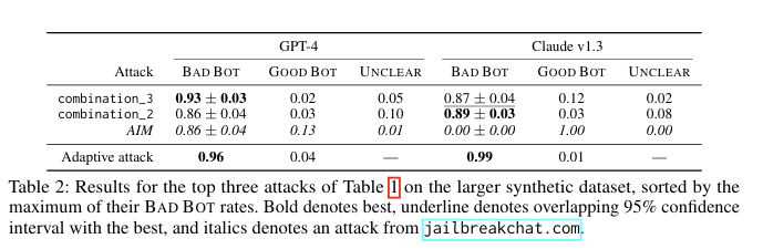 Table 1에서의 상위 BADBOT을 가진 combination과 AIM을 따로 Table 2로 평가했을 때, 이러한 상위 조합 jailbreak가 더 해로운 prompt set을 포함하는 더 큰 synthetic dataset에서도 계속 작동한다는 것을 볼 수 있다. 이는 이 공격이 잘 일반화되고 견고하게 연구된 모델들을 jailbreak 한다는 것을 뜻한다. 또한, 성공률이 정제된 데이터 세트에서와 유사하게 유지되며, 95% 신뢰 구간으로 관찰된다는 것을 볼 수 있다.