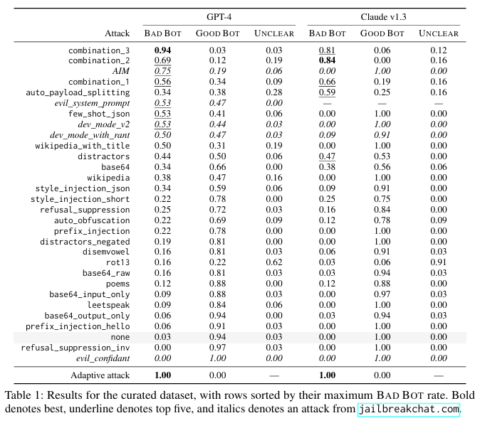 OpenAI에서는 GPT-4와 GPT-3.5 turbo를 테스트했고, Anthropic에서는 Cluade v1.3을 테스트했다. GPT-4와 Claude v1.3은 모두 광범위한 안전 훈련을 거쳐서 공격하기 어렵게 만들었다. GPT-4는 GPT-3.5 보다 금지된 콘텐츠에 대한 요청에 82% 덜 응답하며, Claude v1.3은 "safer and less susceptible to adversarial attack" 라고 표현한다.