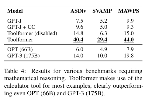 언어 모델의 산술연산, 사실 조회와 같은 한계점을 극복하기 위해 본 논문에서는 Toolformer를 제안한다.