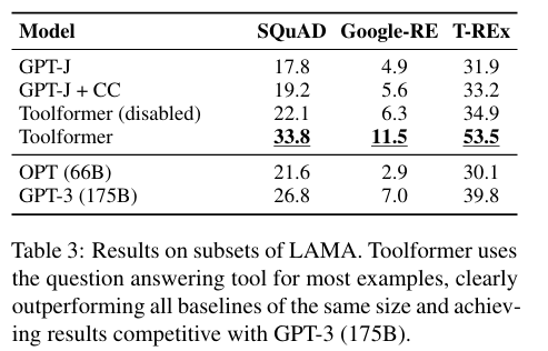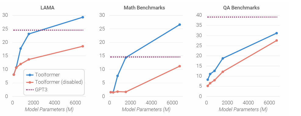 이 모델을 통해서, calculator, Q&A system, search engine, 번역, 달력 등을 포함한 도구들을 통합한다. 본 논문에서 제시한 Toolformer는 다양한 downstream task에서 획기적으로 개선된 zero-shot 성능을 보여주며, 더 큰 언어모델과의 경쟁에서도 핵심 언어 모델링 능력을 보유한다.