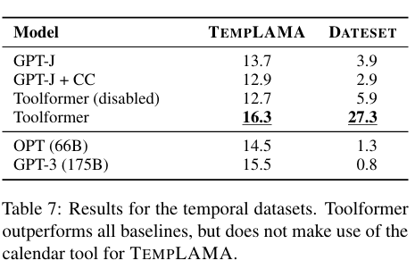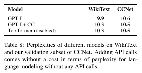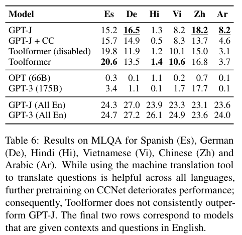 De, Zh, Ar 언어에서 Toolformer는 GPT-J를 넘어서지 못하는 것을 볼 수 있는데, 본 논문에서는 이 점을 CCNet에서의 파이튜닝이 성능을 저하시키기 때문이며, GPT-J의 원래 사전 훈련 데이터와 비교했을 때의 분포 이동 때문일 수 있다고 한다.