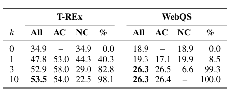 시각자료에서는 LAMA의 T-Rex 부분과 WebQS 부분의 성능을 다양한 k값에 대해서 보여주고 있다. k를 증가시키면 모델이 더 많은 예제에서 API call을 수행하게 되는데, k=1 일 때와 k=10 일 때의 차이를 살펴보면 엄청난 증가를 보여주는 것을 볼 수 있다. WebQS에서는 k를 1에서 3으로 살짝 증가시키더라도 엄청나게 많은 APi call이 이루어지는 것을 볼 수 있다.