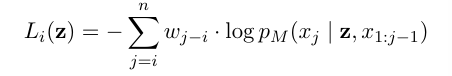M에 대한 weighted cross entropy loss에 대한 식이다. 이 식은 모델이 z 접두사로 이루어진 경우이다.