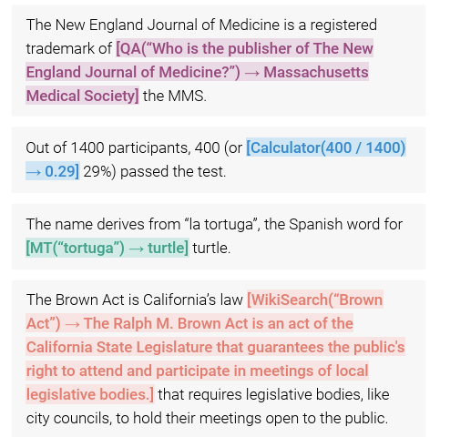 Toolformer : 어떤 API를 호출할지, 언제 호출할지, 어떤 arguments를 전달할지, 결과를 미래 토큰 예측에 어떻게 최선으로 통합할지를 결정하는 모델