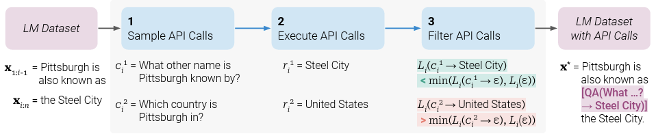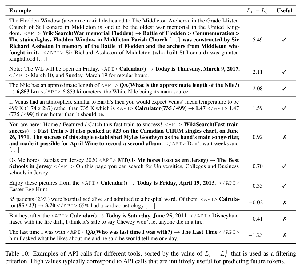 이렇게 파인튜닝을 시키면 API call이 정확히 M이 미래 토큰을 예측하는데 도움이 되는 위치와 입력에 삽입될 수 있으며, 언어모델이 자체적인 피드백 기반으로 언제 어떻게 도구를 사용할지를 결정할 수 있게 된다.