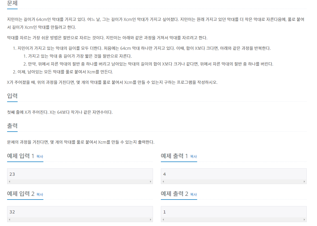 문제는 이러하다. 처음에 읽으면서 이게 뭔 소린가 하면서 3~4번을 다시 읽었던 것 같은데, 결국 예제 입력을 보면서 문제에서 주어진 방식을 하나씩 따라 가다 보니 완벽히 이해를 할 수 있었다. 예제 입력 1을 보면 23을 입력받았고, 64부터 계속 반복해서 나눈 막대기값은 32, 16, 8, 4, 2, 1 이다. 여기서 16, 4, 2, 1을 조합하면 23을 만들어 낼 수 있다. 그래서 조합한 막대기 개수는 4개. 예제 입력 2를 보면 32의 경우 64, 32 에서 바로 32 하나를 가지고 만들 수 있으므로 조합한 막대기 수는 1개가 된다.