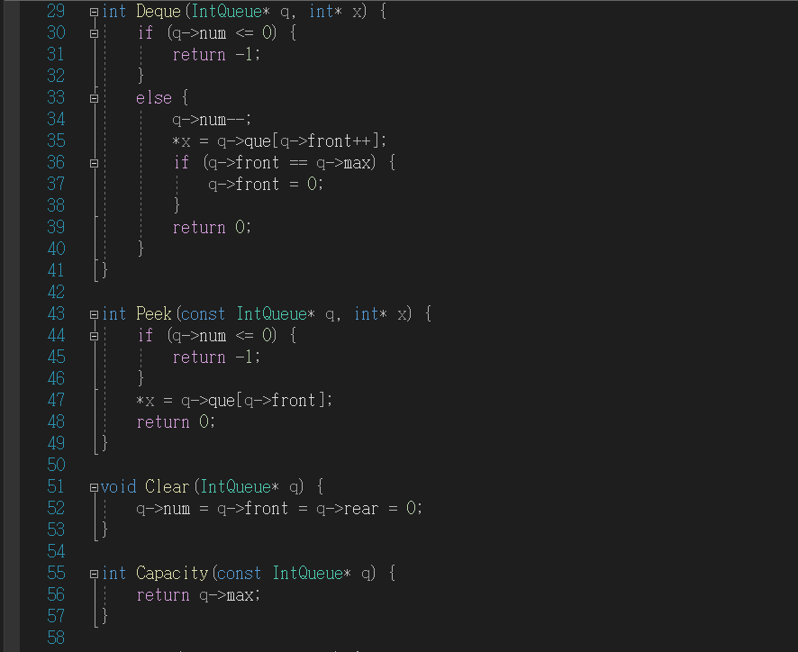 3. Deque : 큐에서 데이터를 디큐하는 함수. 앞에서 인덱스가 빠지게 되므로 front값을 ++시켜서 front 인덱스를 증가시켜준다. 인덱스 개수는 데이터가 빠지기 때문에 감소한다. 인큐와 마찬가지로 데이터 초과 문제가 발생하는데, 디큐하기 전의 front값이 배열 끝이라면 front값이 max와 같아져 배열 마지막 요소의 인덱스를 초과하게 된다. 이것을 방지하기 위해 마지막에 q->front = 0으로 front값을 배열의 처음인 0으로 변경해야 한다.