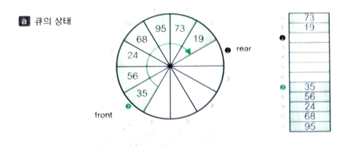 이렇게 배열의 처음과 끝을 연결해서 데이터가 수정되어도 해당 자리에서 자리가 수정되지는 않아 시간 복잡도에서 효율적인 자료 구조이다. 인덱스 max가 10인데 데이터가 12개 들어오게 되는 경우 a[0], a[1]이 자동으로 덮어써지면서 맨 뒤 2개의 값을 받아들인다. a[2],a[3],a[4], ... a[9],a[0],a[1] 이런식으로 큐가 구성되게 된다.