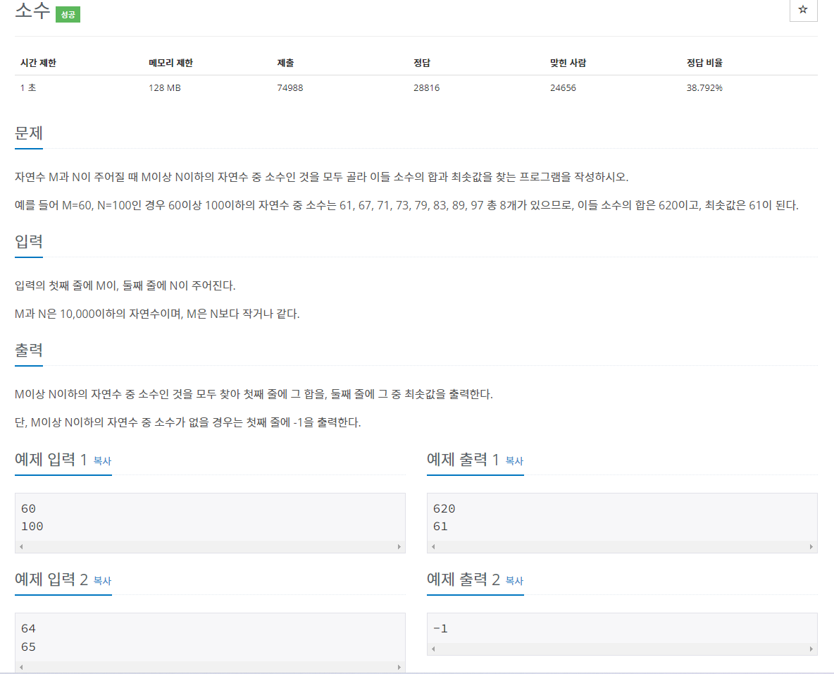 문제는 간단하다. M과 N 사이의 소수의 합과 최솟값을 출력하면 되는 문제이다.