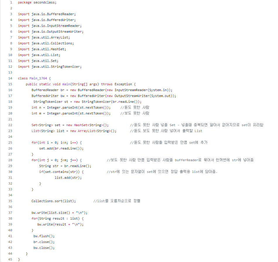 시간을 조금 더 단축시키기 위해 BufferedReader와 BufferedWriter를 사용했고, 출력도 bw.write를 사용하여 출력했다. HashSet에 듣도 못한 사람을 입력시키고, str에 보도 못한 사람을 입력시킨다. 그리고 듣도 못한 사람이 포함된 HashSet에 보도 못한 사람 str이 포함 되어 있다면 새로운 출력을 위한 List에 add 시켜 주었다. 그리고 출력만 해주면 끝!! 생각한 알고리즘대로 짠 것 같아 뿌듯.