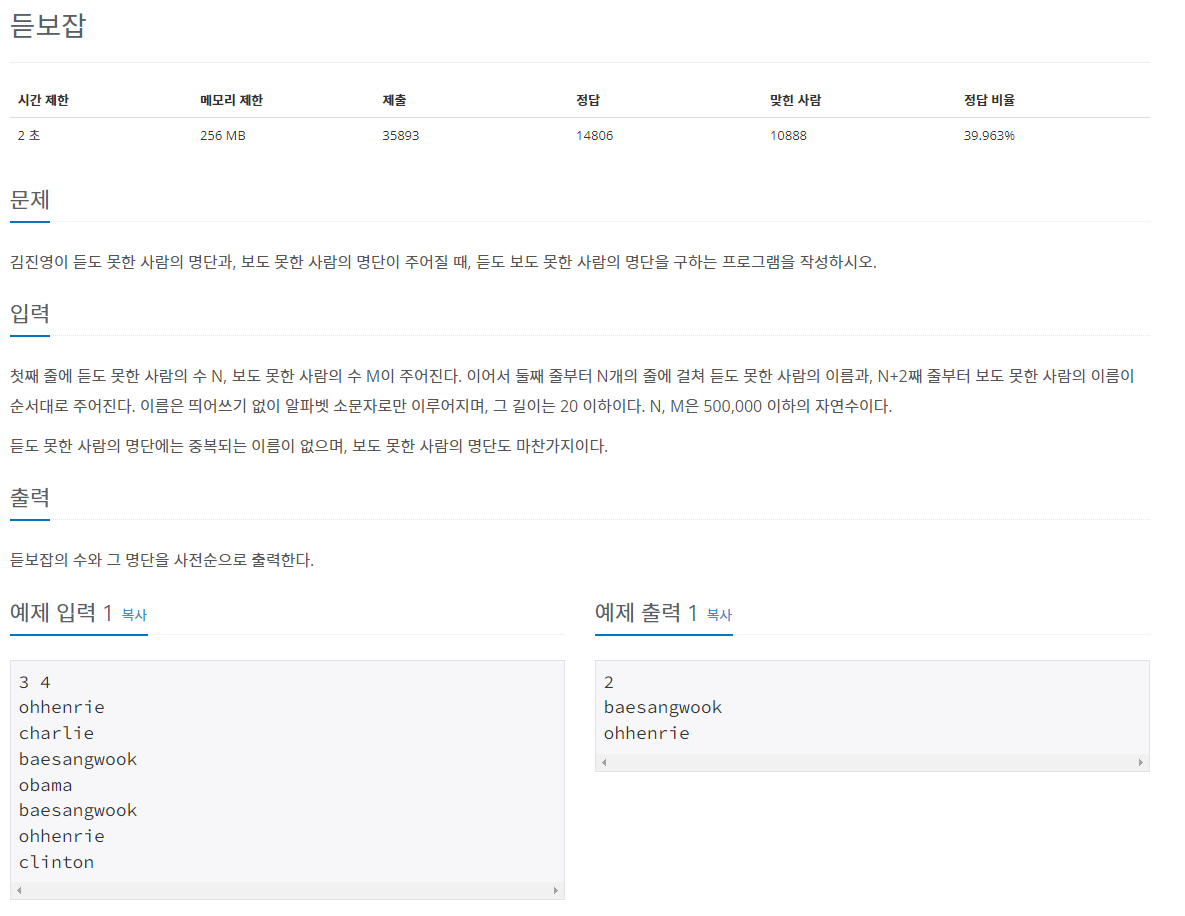 듣도 못한 사람과 보도 못한 사람의 숫자를 입력받고 그만큼씩 사람 이름을 입력받는다. 그리고 듣도 보도 못한 사람을 출력하면 된다. 듣도 못한 사람 집합과 보도 못한 사람 집합의 교집합에 있는 사람 이름을 뽑아 내면 되겠다.