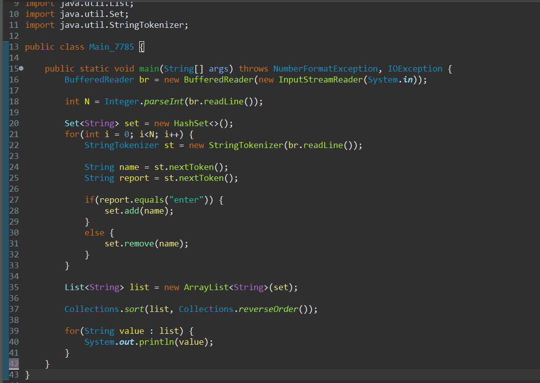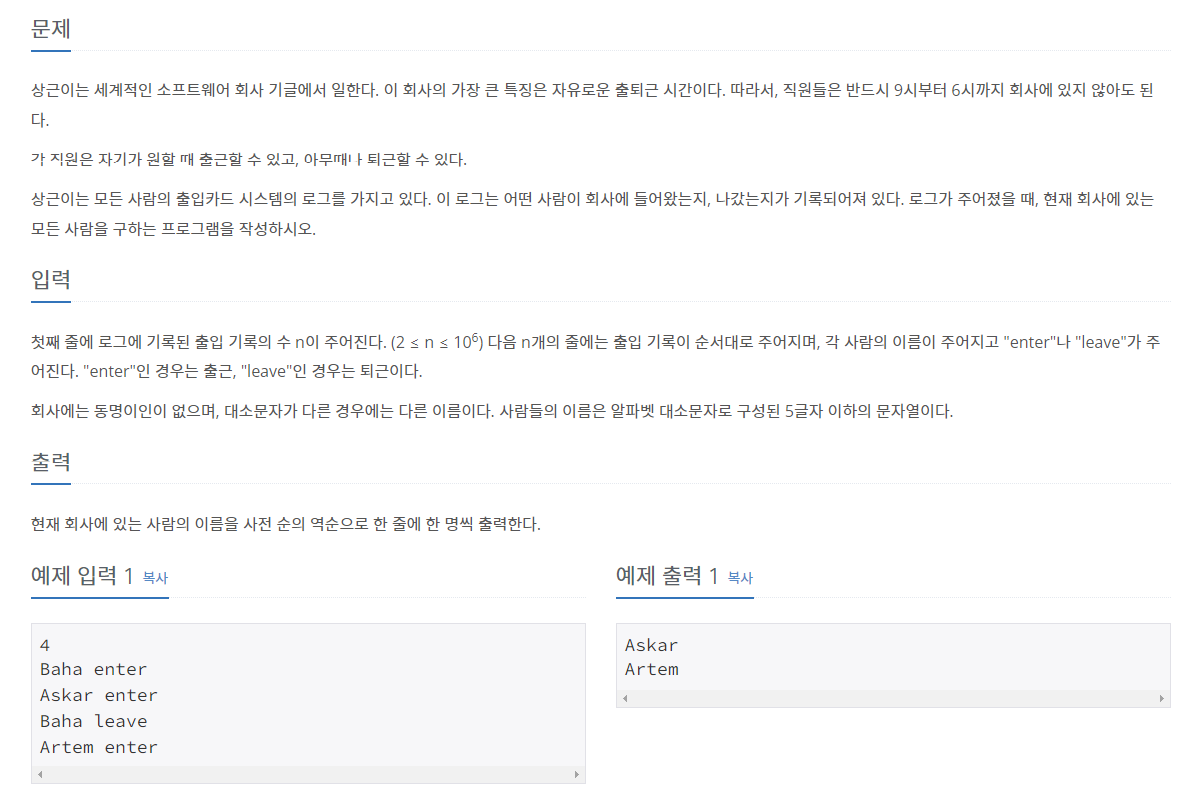 그냥 문제는 간단하다. enter면 회사로 들어가고, leave면 회사로 나오게 되는데 회사로 들어가서 안나온 사람을 찾아서 이름을 사전순의 역순으로 출력시키면 된다.