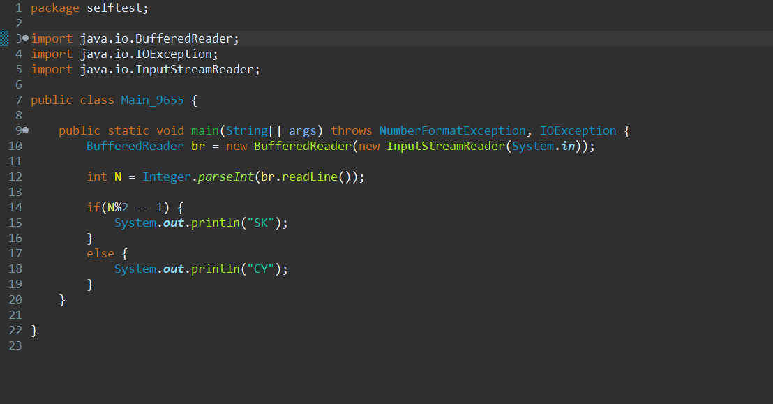 1 or 3은 N%2 == 1인 경우이므로 이렇게 홀수가 나오게 되는 경우 먼저 게임을 시작한 상근이 승리, 짝수라면 창영이 승리