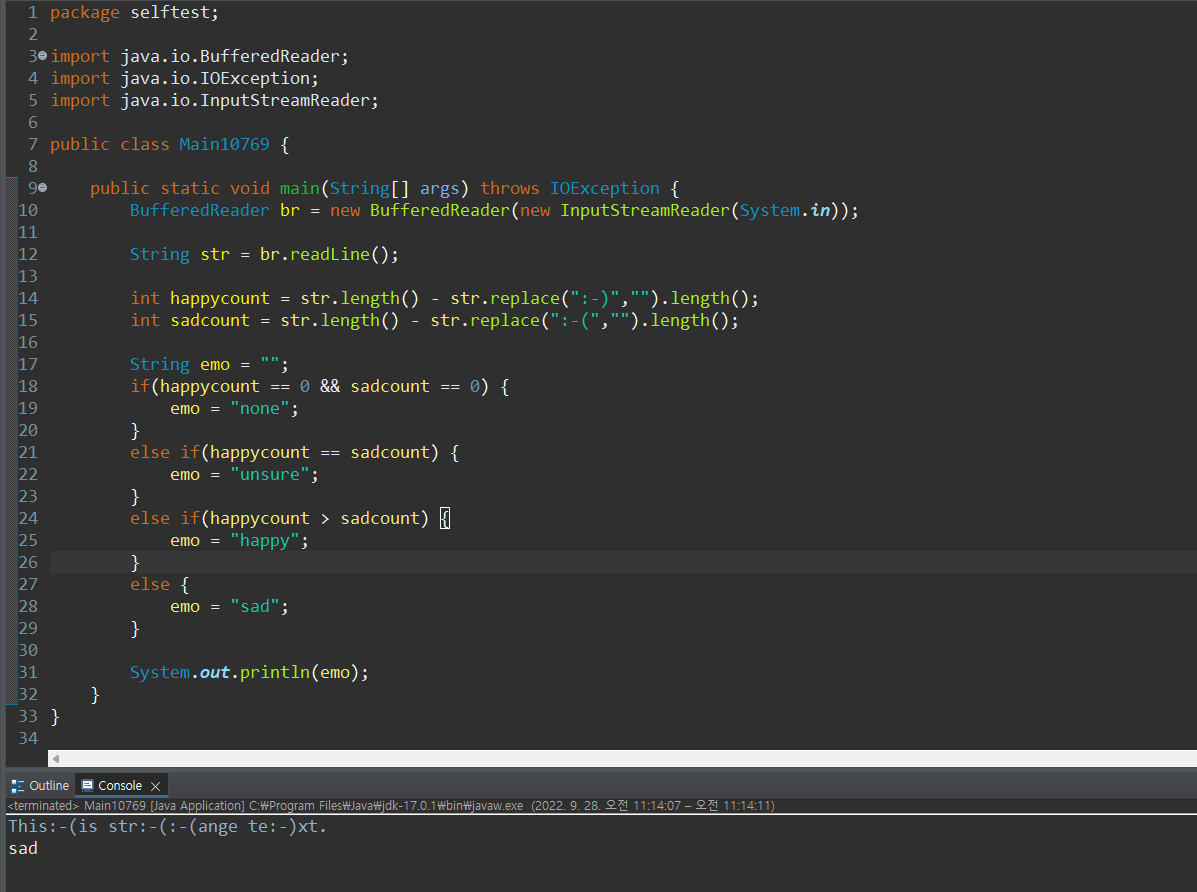 오늘은 백준 10769번 행복한지 슬픈지 문제를 풀어보았다. 정말 딱 브론즈 정도의 문제였다.