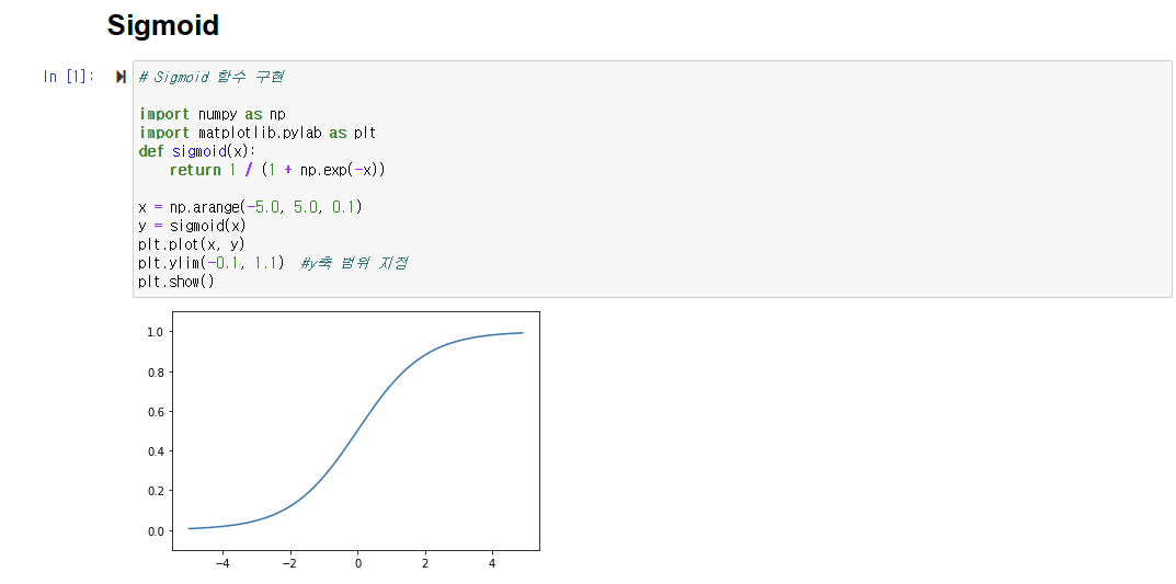 # Sigmoid 함수 구현 import numpy as np import matplotlib.pylab as plt def sigmoid(x): return 1 / (1 + np.exp(-x)) x = np.arange(-5.0, 5.0, 0.1) y = sigmoid(x) plt.plot(x, y) plt.ylim(-0.1, 1.1) #y축 범위 지정 plt.show()이렇게 Sigmoid 함수를 구현해 볼 수 있다.