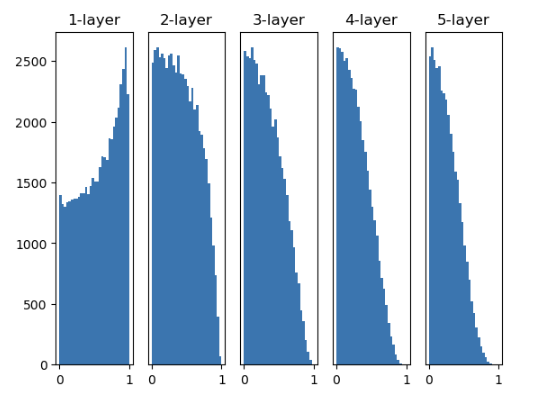 기울기 소실 문제는 일어나지 않았으나, 모든 값이 0.5 근처에 분포하는 것을 볼 수 있다. 다수의 뉴런들이 거의 동일한 값을 출력하고 있기 때문에 뉴런을 여러 개 둔 의미가 없어진다는 뜻이다. 활성화 값들이 0.5에 치우쳐 표현력을 제한하는 문제를 불러 온다.